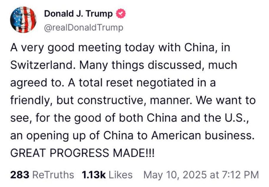 The market has adapted to Trump's style, with volatility around his comments tapering as credibility and predictability declined. Looking at his latest “truth” above about a reset with China, one can look through the capital letters and conclude that there is very little substantive detail but vibrant emotional tone, persuasive language, and impression management. As markets have bounced back and reversed some extreme pricing seen in April after some walk-backs of the initial rhetoric, his impact from here should diminish. I wouldn’t be surprised if markets largely disregard his comments in a few months. Until then, we shall continue to follow his every step. I think this is more parody than a sincere political approach. Stay nimble out there.