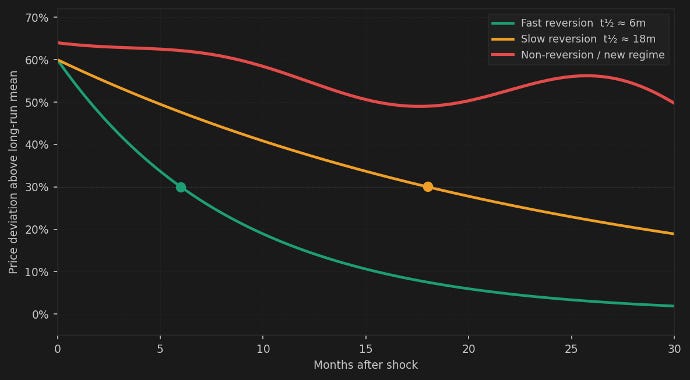 The dominant model for commodity prices is the Ornstein-Uhlenbeck process — the mathematical form of mean reversion. The pull towards the long-run mean happens at speed κ. The half-life of that reversion is t½ = ln(2)/κ.