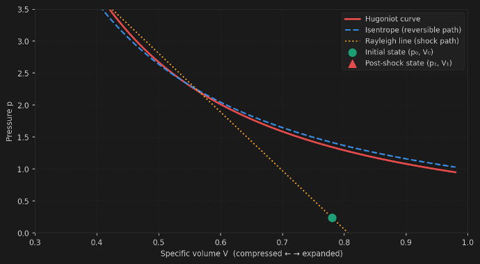 Shocks were formalised in the 19th century by Rankine and Hugoniot. Their insight: across any shock front, mass, momentum, and energy are conserved — but the post-shock state is permanently different. The diagram below shows this in the pressure-volume plane. The Hugoniot curve traces every possible post-shock state. The isentrope is the smooth, reversible path that would have existed in the absence of a shock. The gap between them is entropy — irreversibility baked in.