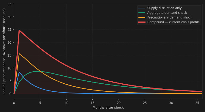 Lutz Kilian’s seminal 2009 paper decomposed oil price shocks into three structural types: supply disruptions, aggregate demand shocks, and precautionary demand shocks driven by fear. Each has a distinct impulse response and a different half-life. The compound shock combines all three — that is the current crisis profile.