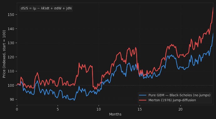 Merton borrowed this logic directly. His jump-diffusion model separates markets into two regimes: continuous diffusion on normal days, punctuated by Poisson-distributed jumps of random size. The SDE is dS/S = (μ − λk̄)dt + σdW + JdN. The jump term JdN is the shock front. The model does not assume reversion. It accepts a new level, and diffusion resumes from there.