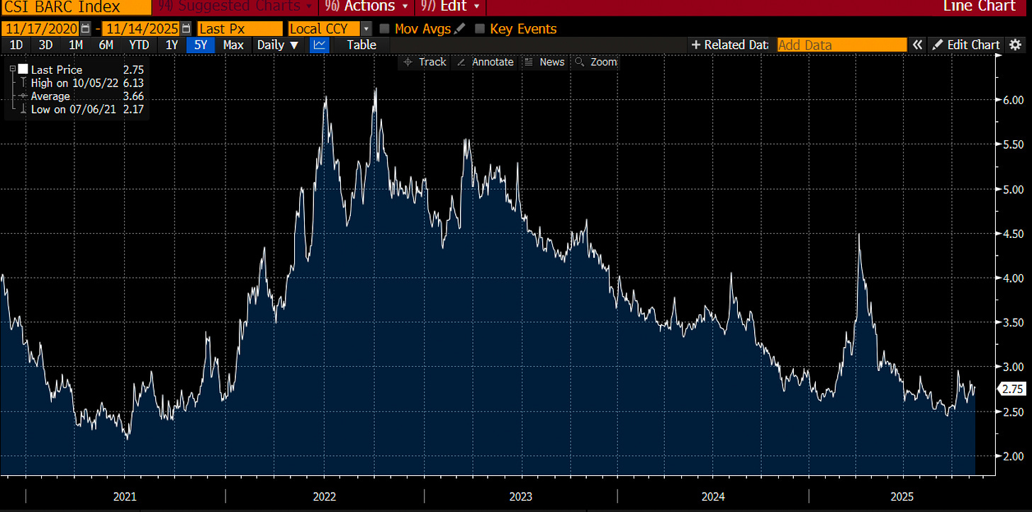 An April-type environment should see higher corporate spreads, especially in high-yield, which has seen spreads compressing to new 2-year lows before jumping by around 25 bps more recently. I would keep an eye on this to see whether the ongoing volatility and credit contagion continue to stress markets.