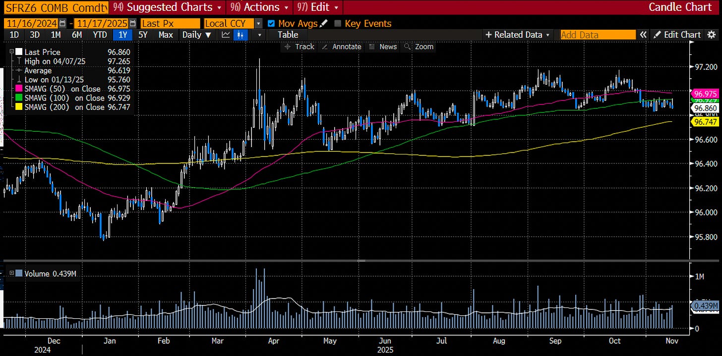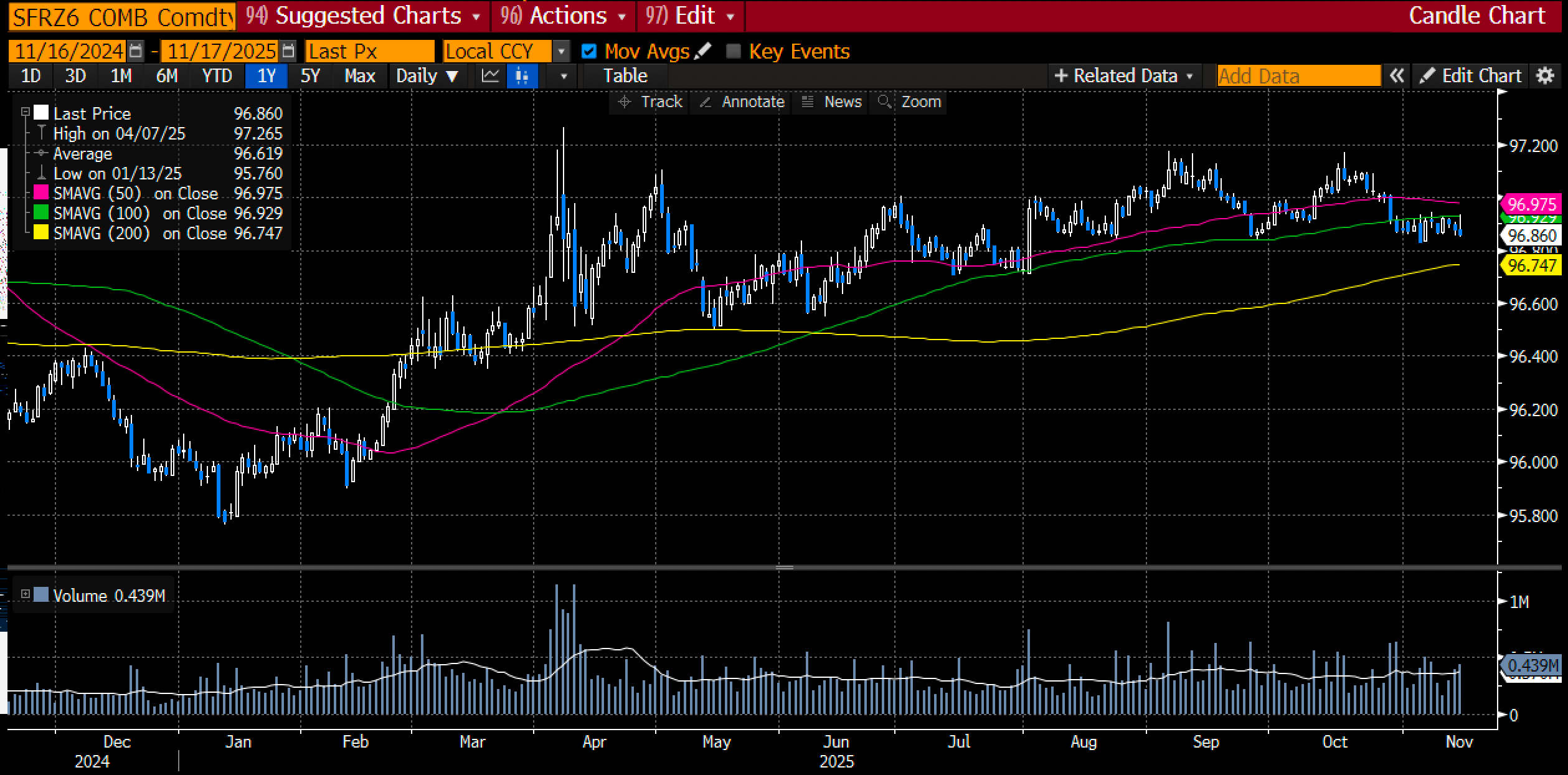 SFRZ6 (December 2026) has formed a double top and has now struggled to regain the area above the 100 moving average. If December is uncertain, the terminal rate should also rightly be questioned.