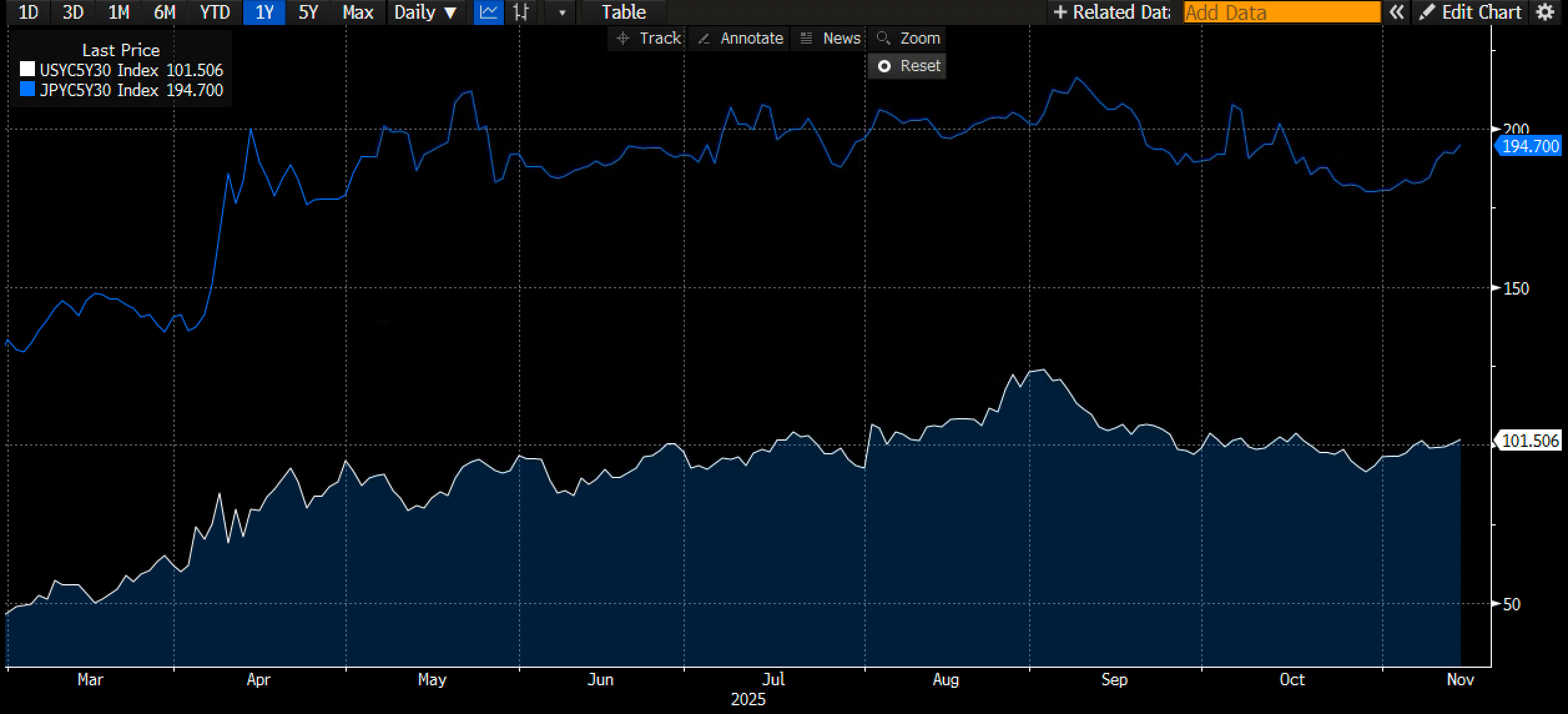 Yield Curves have started to steepen again, with 5-30s creeping above 100 bps once again. It is also essential to keep the Japanese curve in mind, which has previously led the curve cycle higher this year.