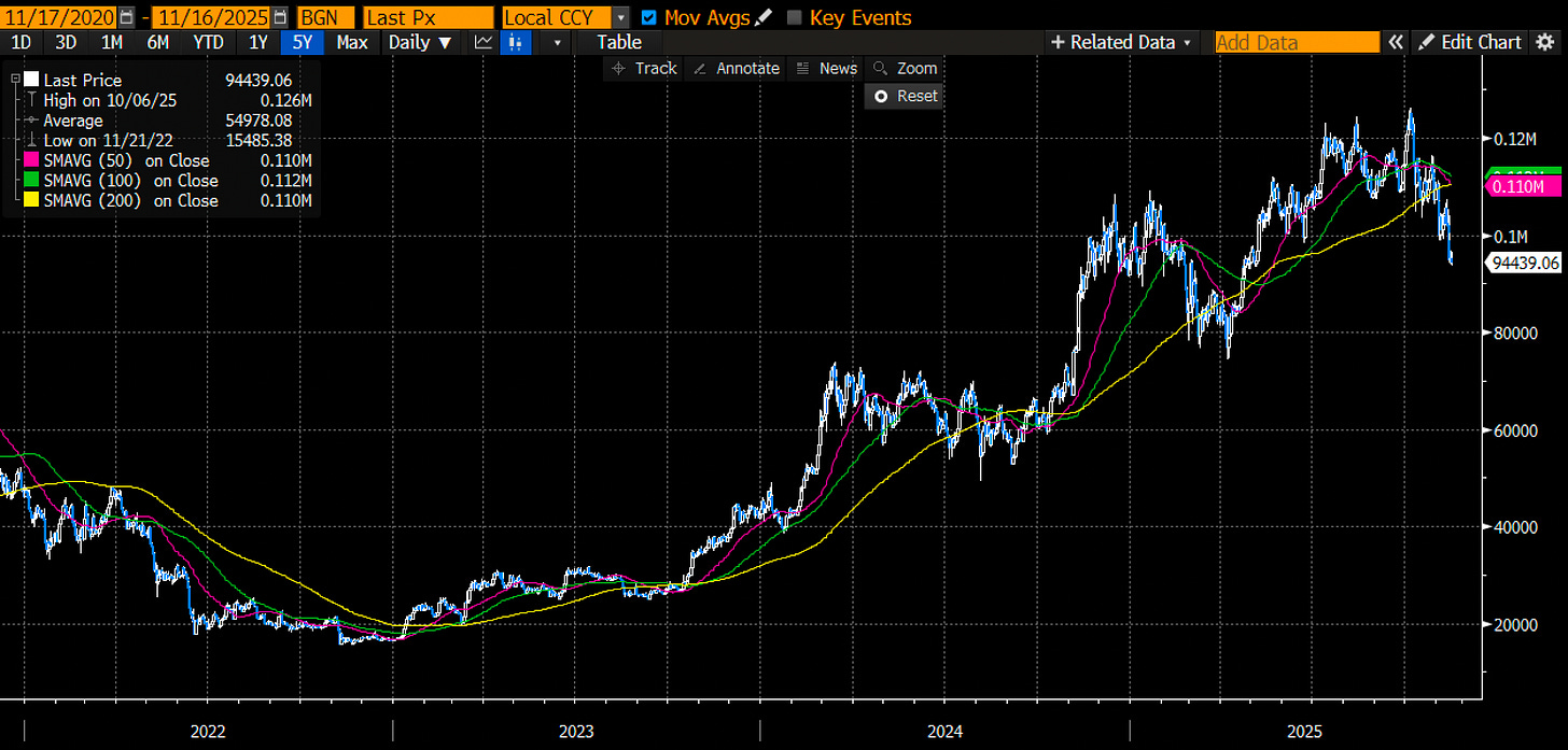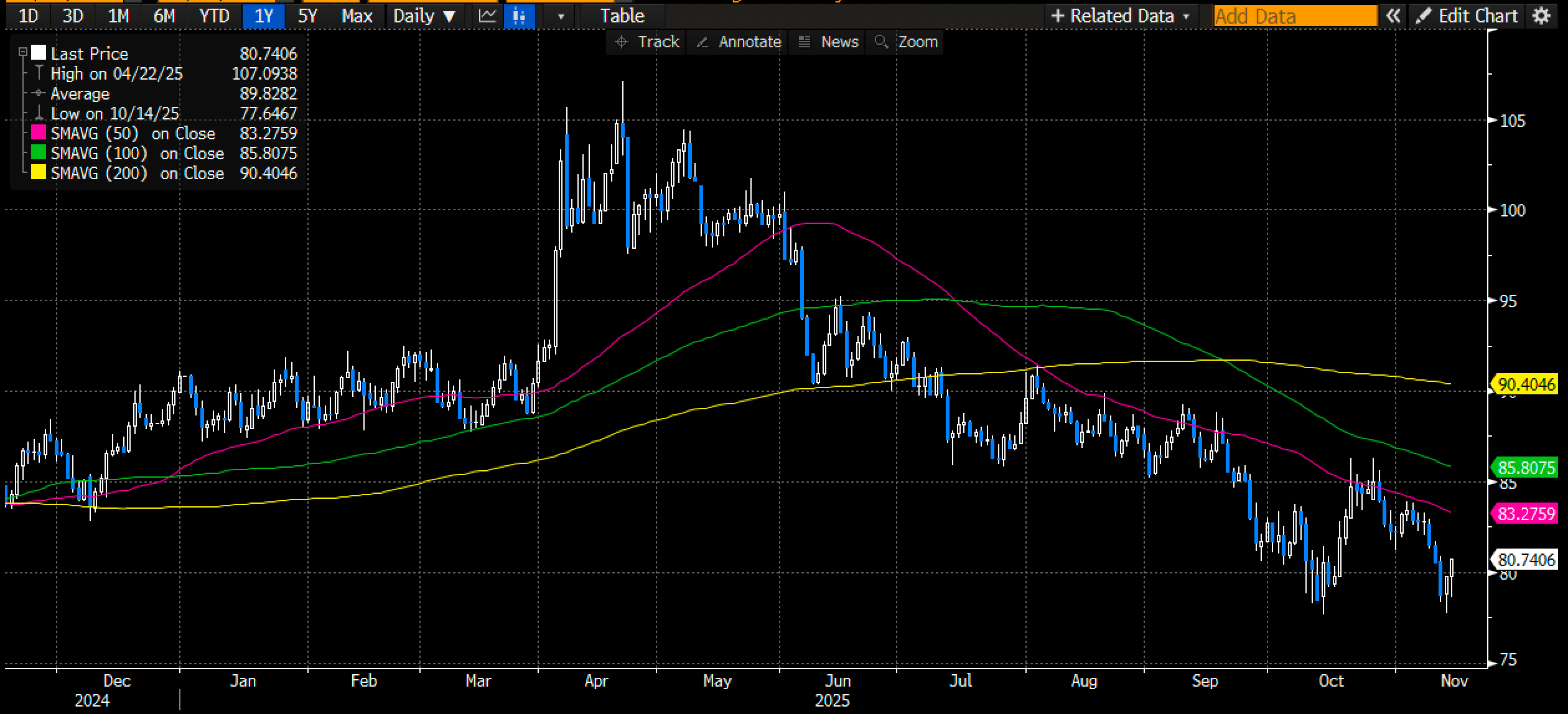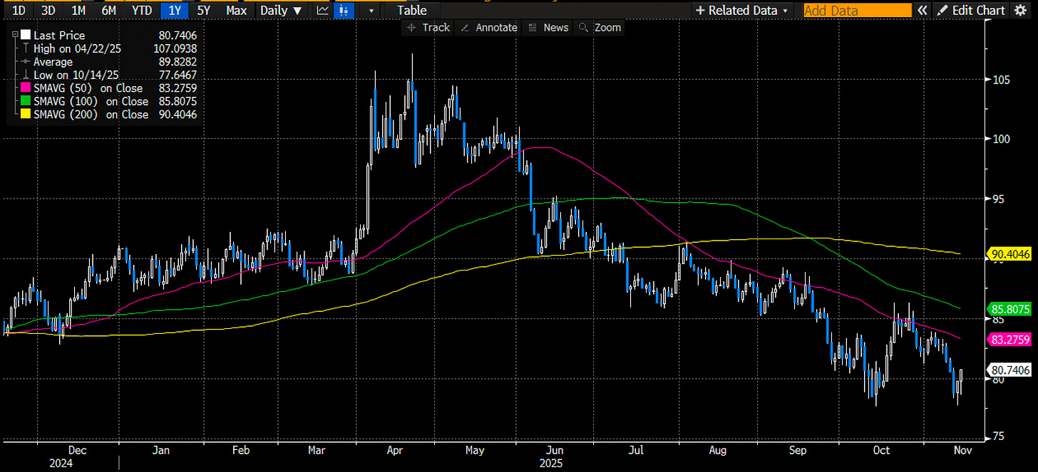Bitcoin is under continued pressure, with the year’s lows below 80k now looking as the next firm support zone.