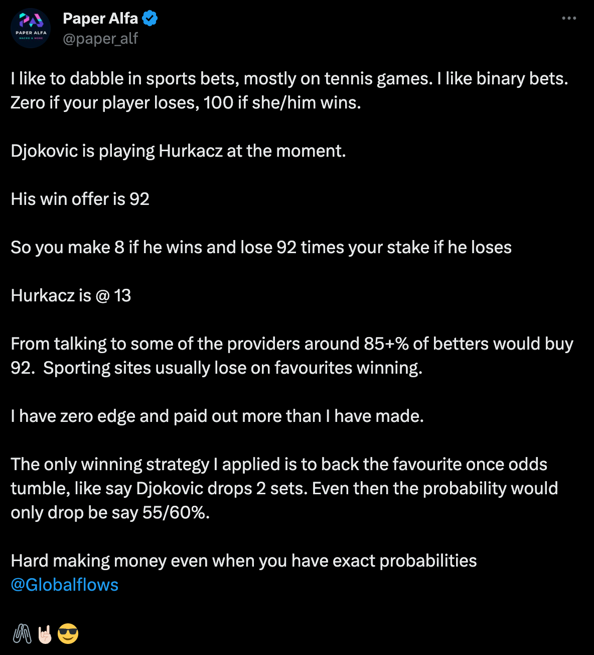 Using my sports betting analogy from yesterday’s tweet (see below). Do you think the price changes with every point? Yes, absolutely, it’s constantly moving. Will the last point influence the next one? Possibly but it is no guarantee. If you watched the match, you might have realised Djokovic’s amazing record when it comes to tie-breaks. He won 12 Tie-Breaks in a row. When his opponent was hammering down aces and had 3 set points at 6-3 on his own serve, the match probability only moved down a bit. And as it happened, he turned that first set around and won the breaker 8-6, as well as the next set’s tie-break (match suspended and will resume today).
