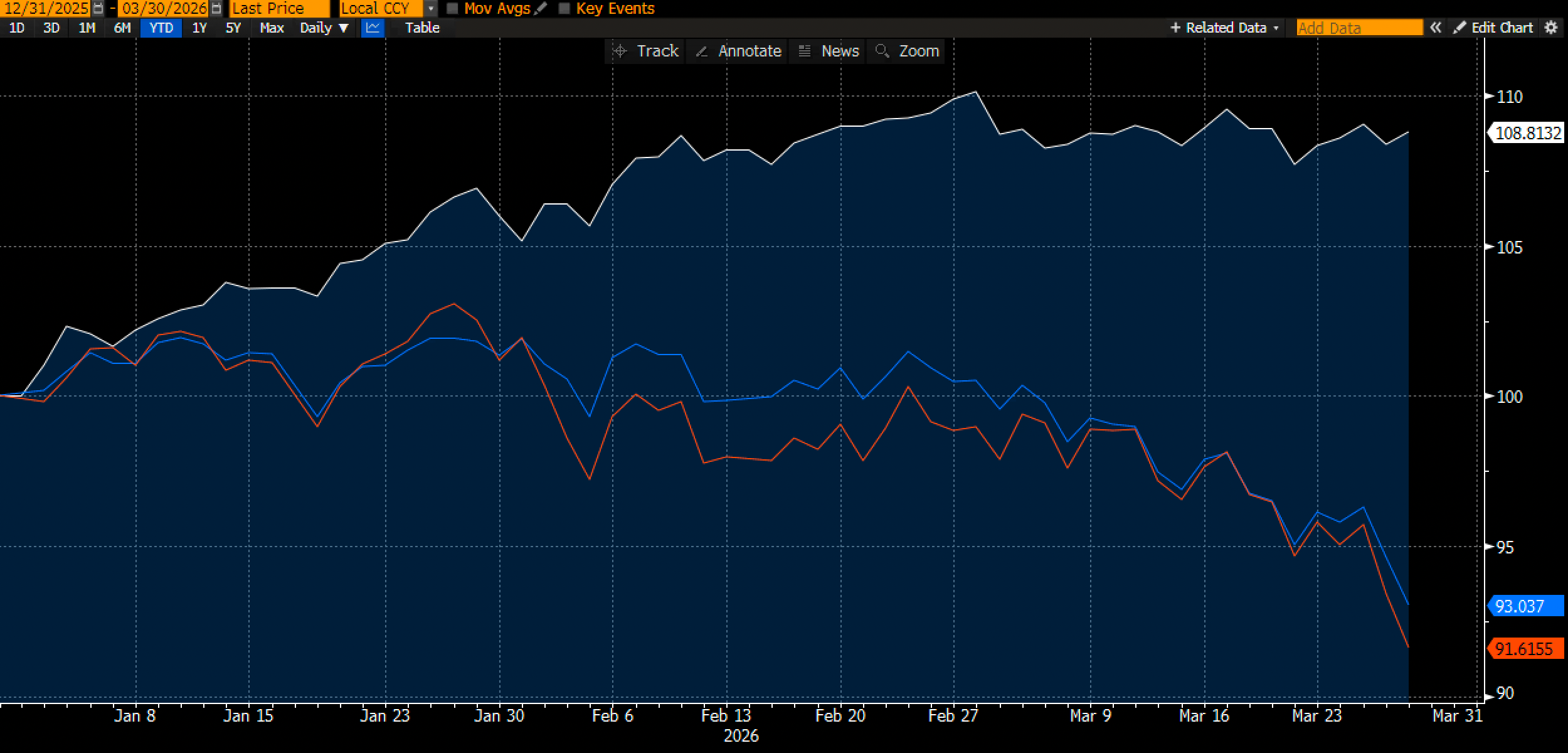Our buy-and-hold 2026 portfolio (white line below) is up 8.8% YTD and comfortably outperforming the SPX (blue) and Nasdaq (red).