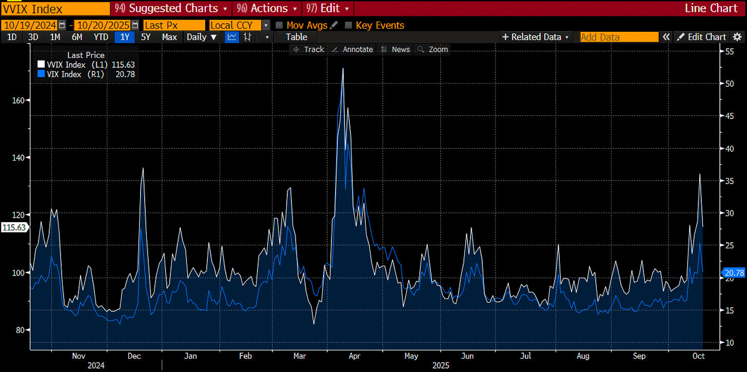 VVIX (see below) has spiked into April/May territory. Gold has seen its best bull run since 2010, which was a 9-week run. Regional bank credit tightening aligns with repo tightening and record margin debt. It is also notable that SOFR options now price in both a small probability of 50 bps cuts in the October and December FOMC meetings. Clearly, this is still related to a possible 2023 SVB replay. Bonds have seen a reversal on Friday as negative risk sentiment was somewhat overextended, but I think the bid in bonds is not over yet.