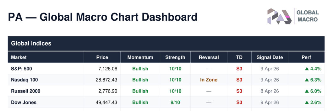 The PA - Global Macro Chart Dashboard is a daily technical analysis summary covering ~200 securities across 9 asset classes: global equity indices, US sectors, US & international stocks, ETFs, fixed income, FX, commodities, and crypto. It is generated after market close and provides an at-a-glance view of trend direction, momentum, reversal signals, and sequential counts for every instrument.