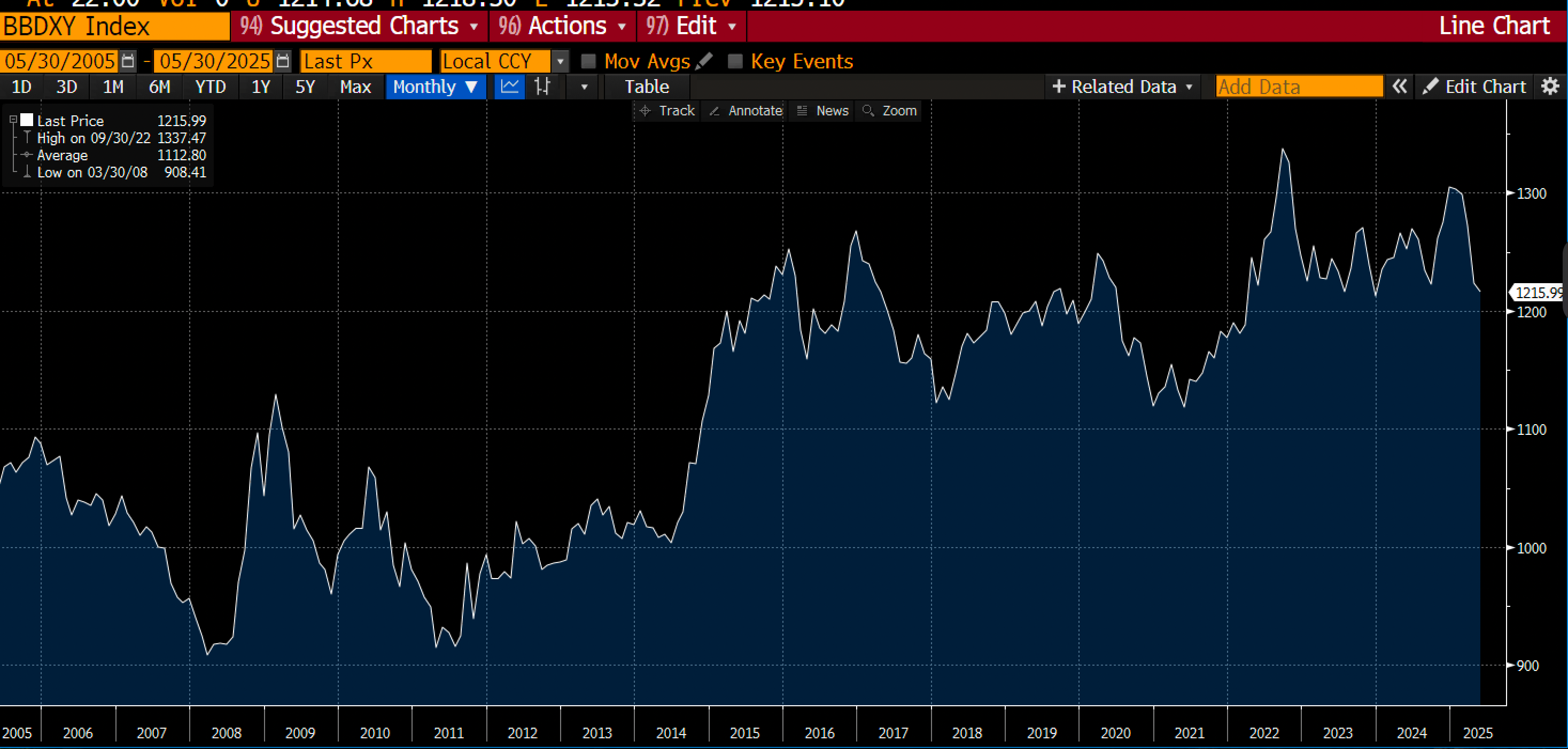 In a curious piece, a Financial Times article highlighted concerns over Section 899 in Donald Trump's recent budget bill, which proposes higher taxes on foreign investments in the US. Investors fear that this provision could deter foreign investors, potentially impacting corporate investment and asset markets. Critics argue it risks cooling foreign interest in US assets, complicating debt financing efforts amidst rising deficits. Analysts also debate the ambiguity surrounding its impact on US bond holdings, which could further unsettle international confidence in US economic policies. The underpinnings of the global monetary system, backed by liquid and most sought-after collateral in Treasury securities, are shaking. You don’t want to lose sight of this. Looking at the Bloomberg USD Index over time, the US Dollar has plenty of room to depreciate from current levels.