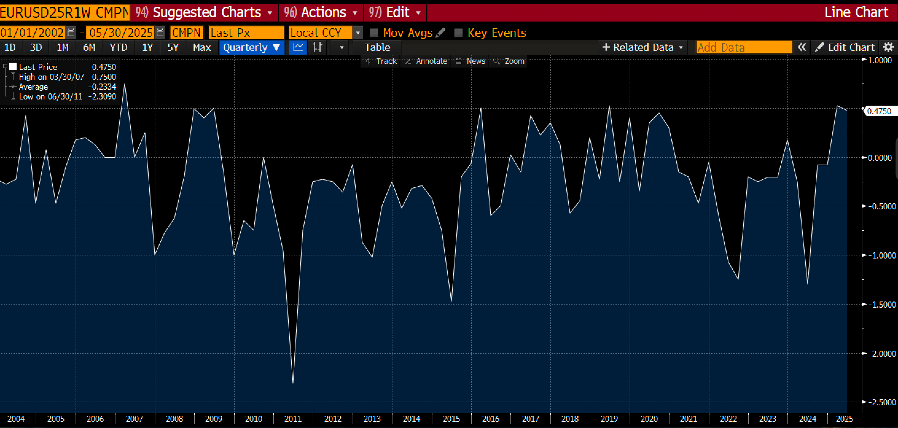 Secular trends take years to play out. This doesn’t mean there can be vicious counter-trend rallies. In fact, you can be certain those moves will occur. Looking at EUR/USD Risk reversals (25 delta calls vs. puts), it would indicate that there is heightened option activity already in play, as most Hedge Funds play OTC options to gain leverage from further Dollar depreciation.