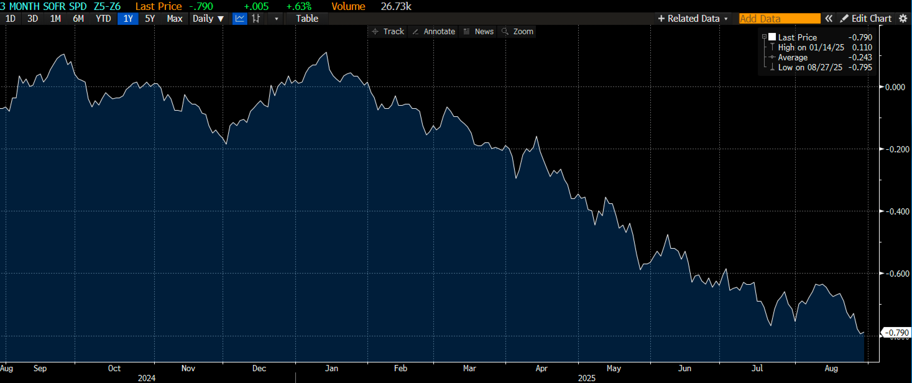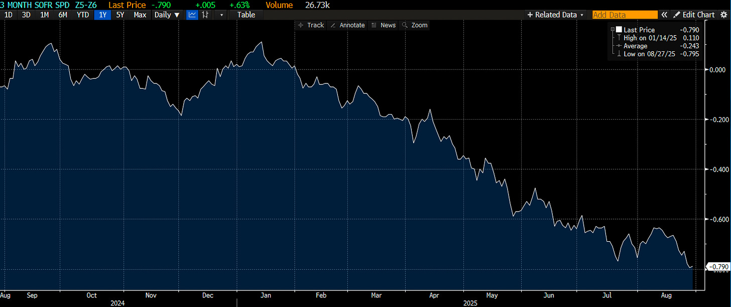 Rate markets have caught a bit of a bid, and we have seen quite a sizeable yield curve steepening during the month. We now have a reversal signal flashing, which I shared with paying subscribers through the Substack chat. We are now awaiting payroll and inflation data to establish the extent of the cycle. So far, the cycle seems again predominantly loaded in 2026, under the assumption that a new governor will push the cutting button several times. SOFR Z5/Z6 spread is at -79, with two cuts already priced into the end of the year. Just looking at economics, this pricing seems a bit too much for my taste.