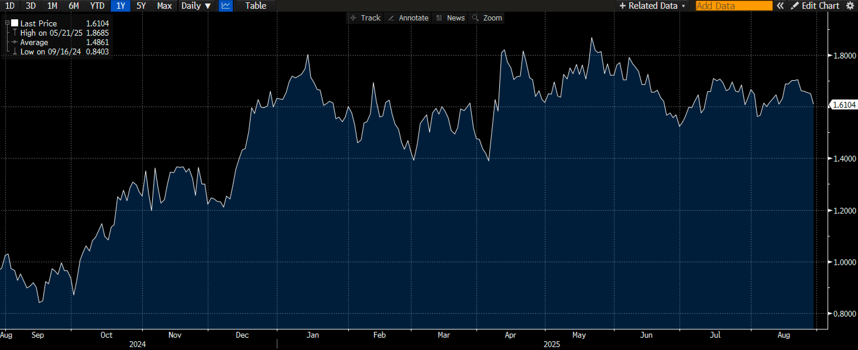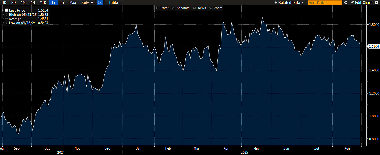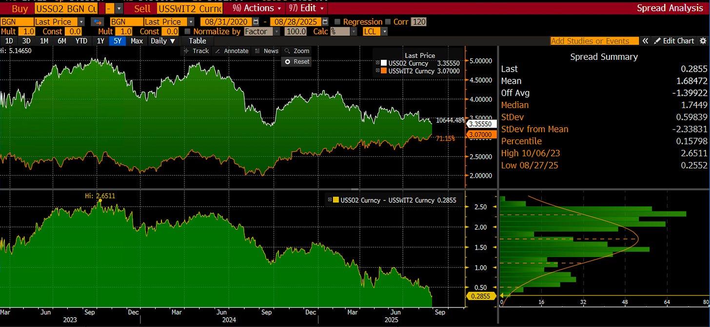 It’s interesting to examine real rates, with 2-year reals (2-year OIS vs. 2-year inflation swaps) trending lower. From the highs in mid-2024, we have now seen a 200-basis-point rally, now hovering just above zero. Admittedly, short real rates don’t influence the wider economy much, but they give us an indication as to where Fed policy rates are.