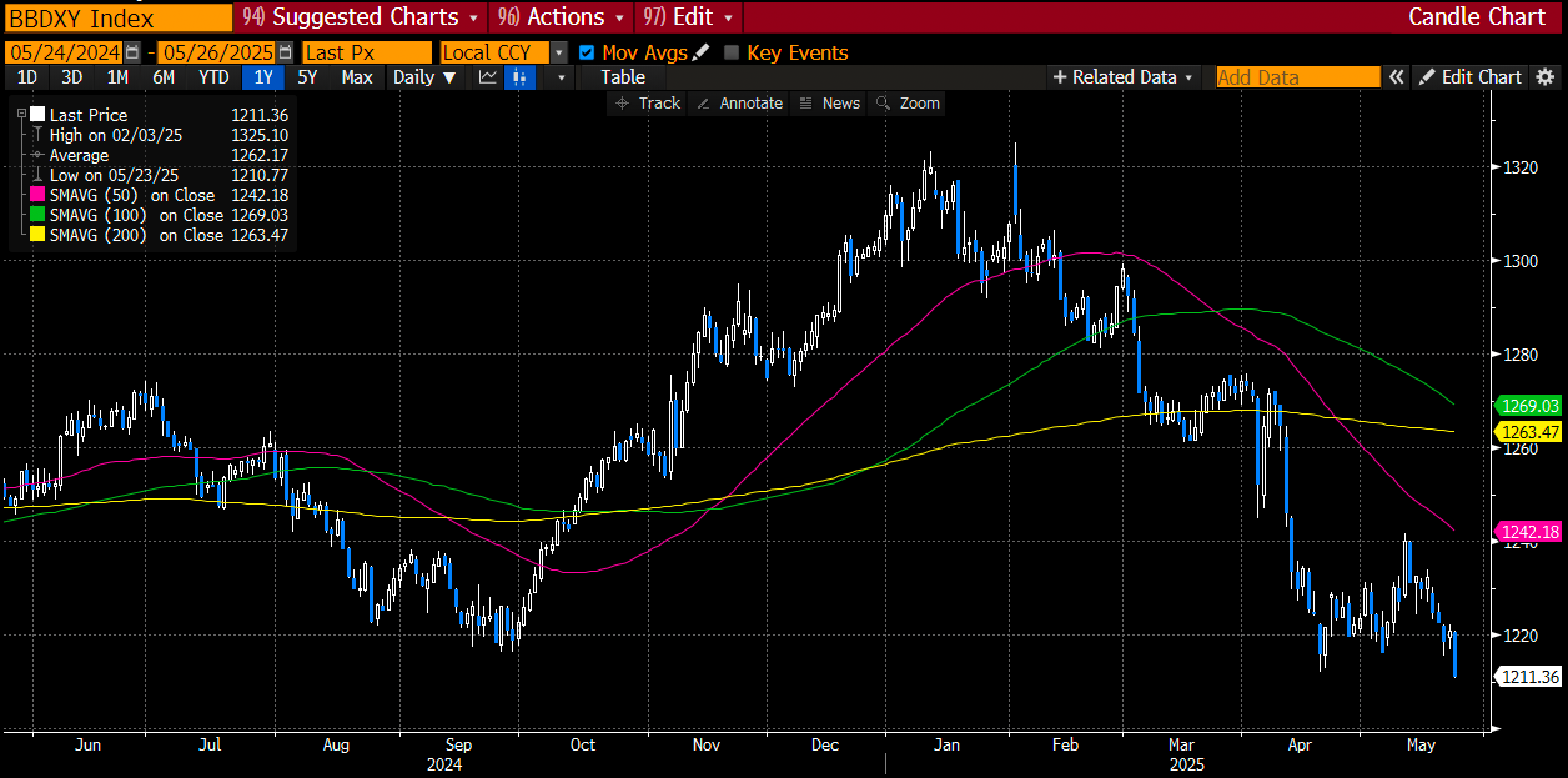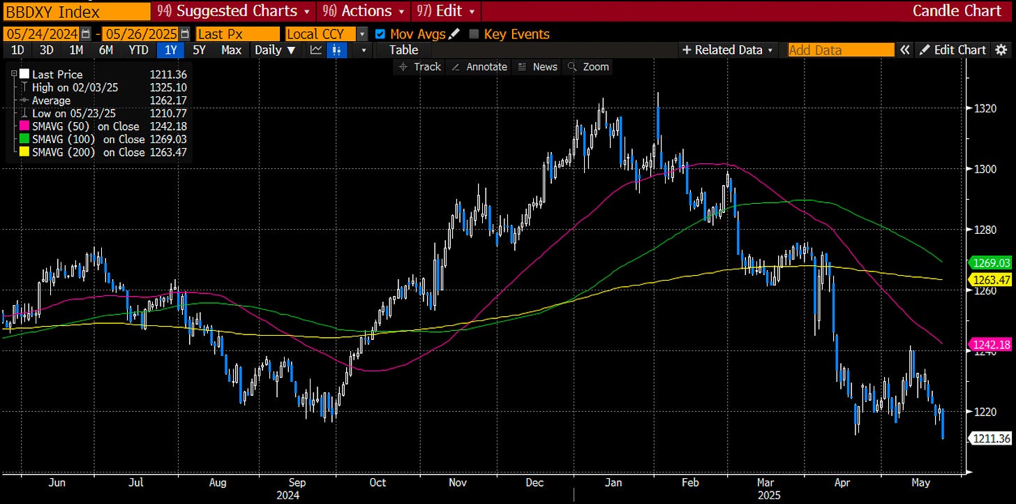 The US Dollar has notably printed new lows in May when looking at the equally weighted currency index from Bloomberg below.