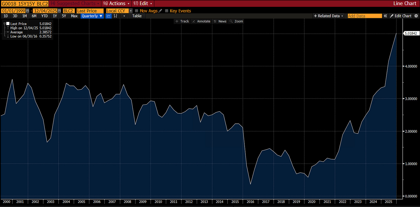As front-end rates can’t keep pace with inflation, the long end of the curve has to reflect those dynamics. As such, it’s interesting to see the 15y15y forward rate recently reach 5%.