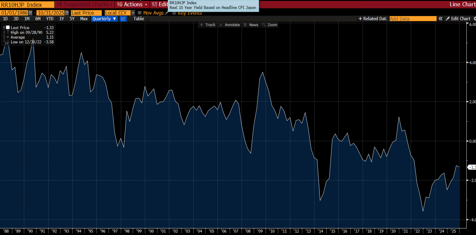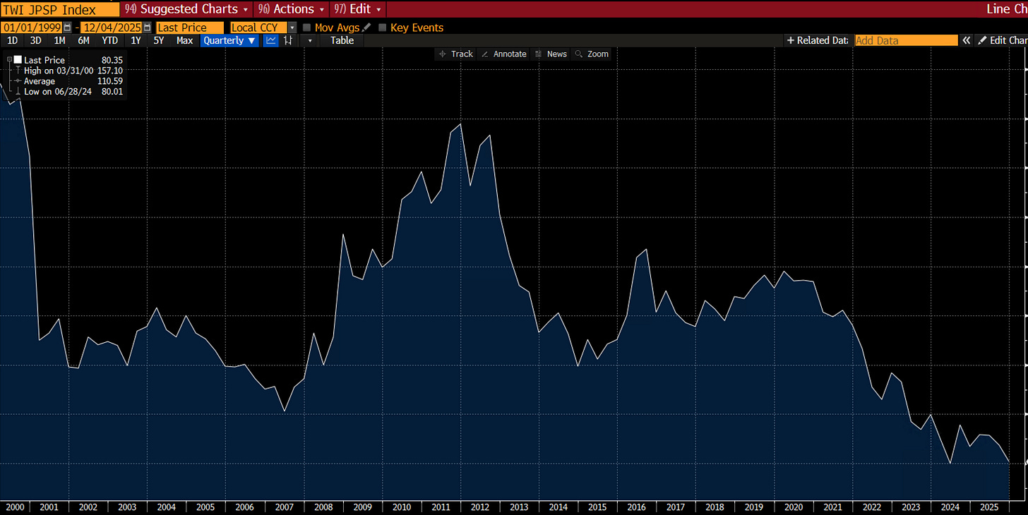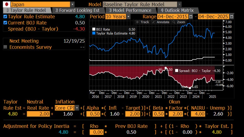 Any Taylor-rule approach would dictate rates to be much higher, with Bloomberg’s version pointing to closer to 5%, “only” 4% away. Make no mistake, there is no way the BoJ will ever get anywhere close to that. Real yields will likely remain negative.