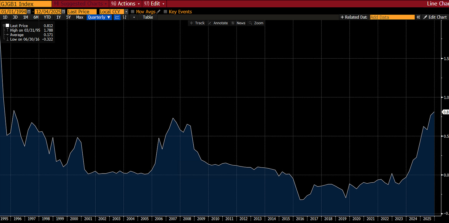 December started with quite a bang. Driven by what seemed like an all-but go-ahead for the BoJ’s December hike as Ueda delivered his speech in Nagoya. The Governor struck a quietly confident tone, arguing Japan’s recovery remains intact and inflation is evolving toward the 2% goal. The recent GDP dip was “temporary,” tariffs have hurt less than feared, and AI-driven demand is supporting exports. With core CPI near 3% but set to cool before rising again, Ueda signalled that rate hikes will continue “to ease off the accelerator, not hit the brakes.” Wage growth above 5% and tight labour markets strengthen his case for gradual normalisation — real rates, he noted, remain deeply accommodative.