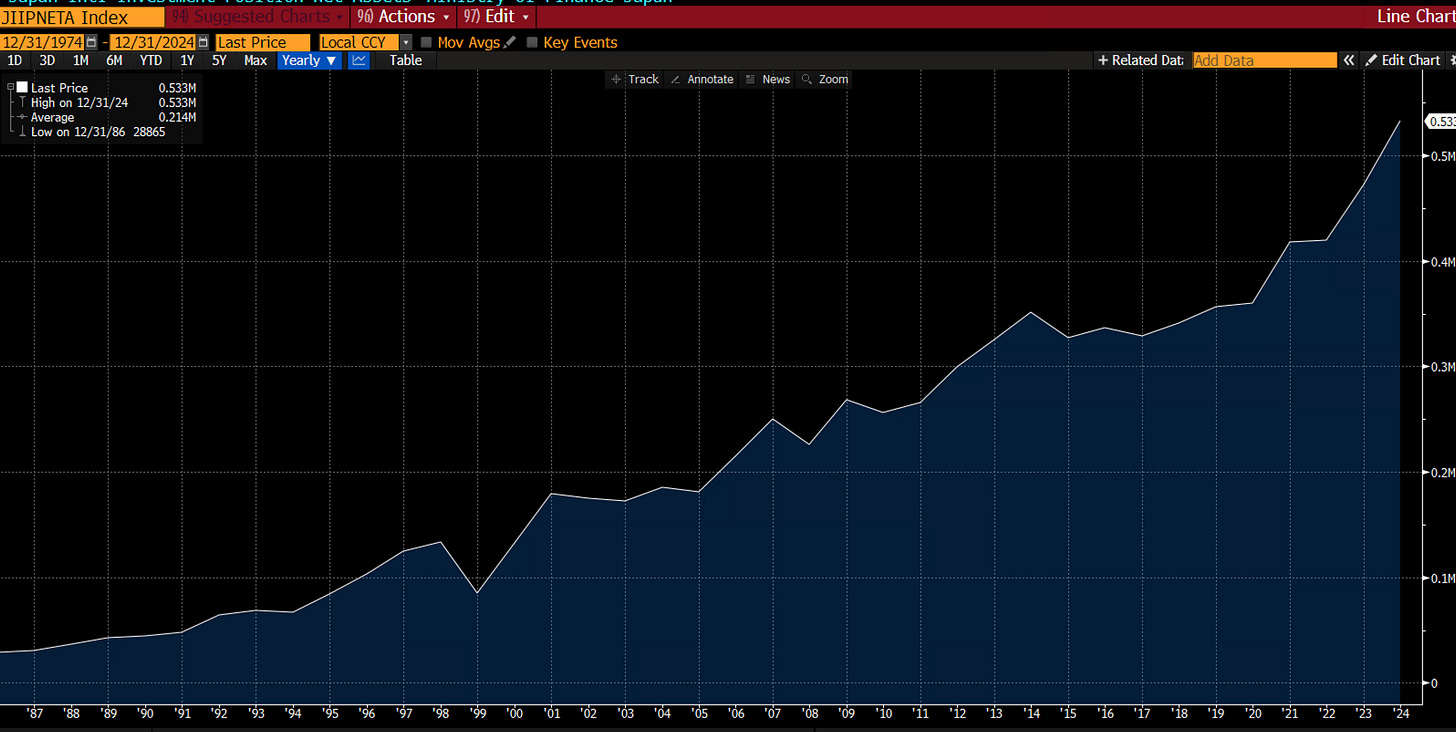 Japan’s net international investment position stands at around 3.5 trillion USD. That’s how many assets the Japanese hold vs the rest of the world holding Japanese assets. It’s a staggering 100% of GDP, which is often referred to as the big carry trade. That’s, however, misleading as a large chunk of those assets is being hedged back into the domestic currency, which is costly.
