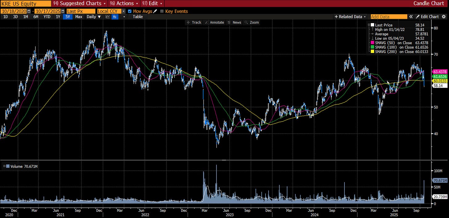 Are we in such a moment? Thursday’s strong sell-off in US regional banks (KRE) brought up memories from 2023’s SVB-related sell-off. As of now, not much is really clear. There are direct credit losses, and then there’s NDFI (non-depository financial institution lending). It’s the second that’s causing the most angst. Put simply, it’s a regulatory issue. Bank lending to a financial intermediary (shadow bank) rather than the end borrower can drop RWA (risk-weighted assets) treatment from 100% (direct lending) to an average 22% (intermediary). The write-offs so far seem very small for Zions Bancorp and Western Alliance; it’s the contagion that people will always be most worried about.