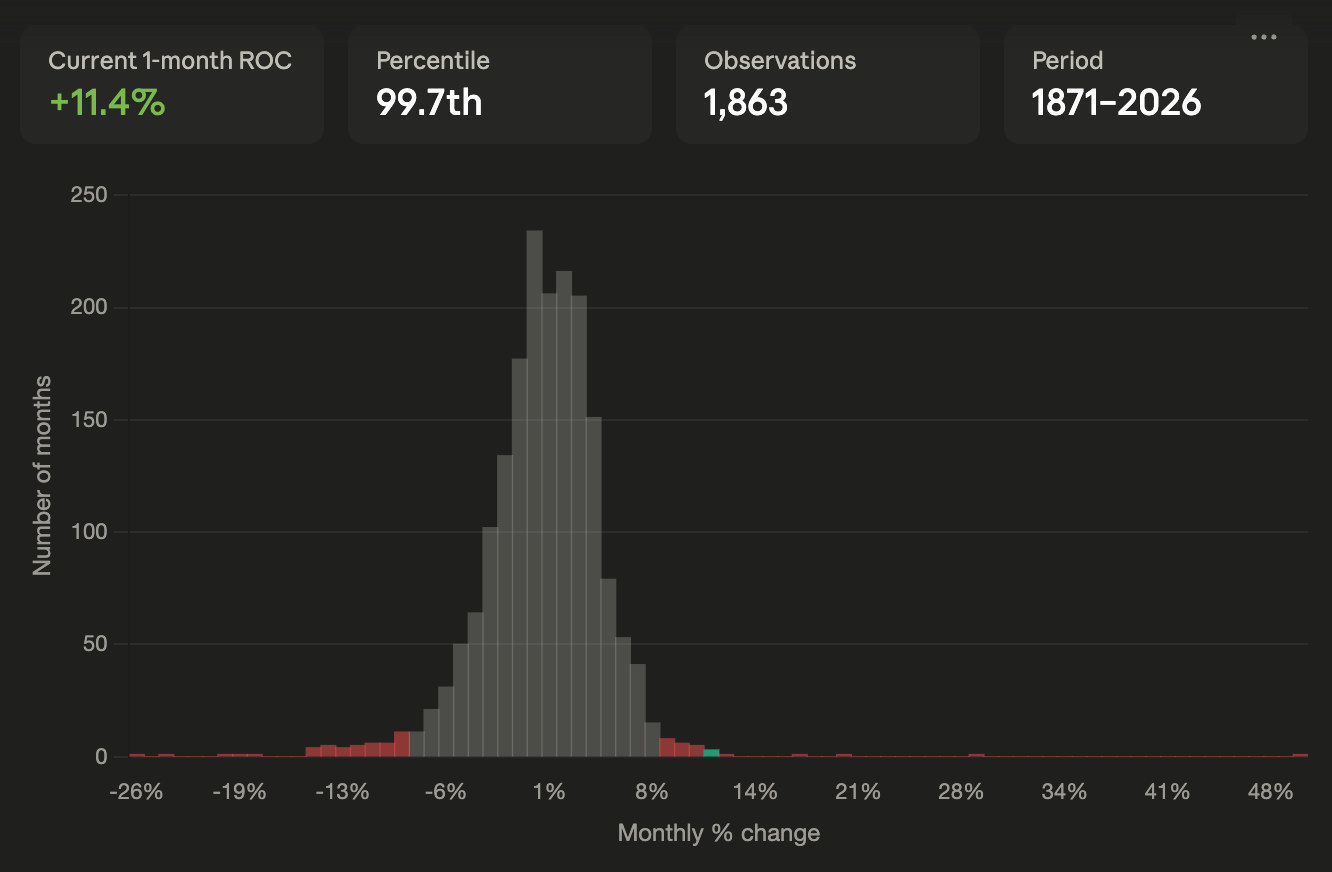 The current move sits firmly in the extreme right tail. Of the 13 prior instances, the majority occurred at major secular turning points — bottoms of bear markets or the end of geopolitical crises. The question, as always, is whether this is 2009 (launch of a durable new uptrend) or late 1932 (violent counter-rally within a longer bear market).