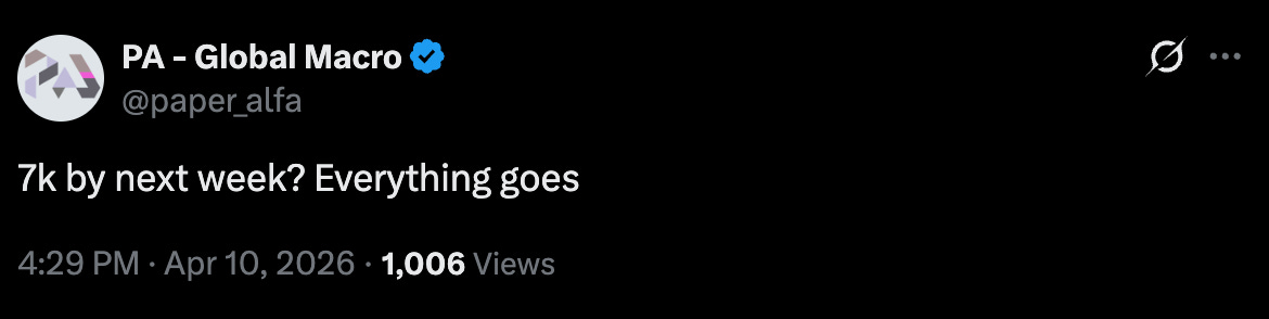 The SPX hit a fresh all-time high on Wednesday, closing above 7,000 for the first time. After falling nearly 10% from its January peak into late March — deep enough to qualify as a textbook correction — the index has roared back more than 10% in two weeks. The Nasdaq has gone from oversold to overbought in just 11 trading sessions, the fastest such swing in data going back to the early 1980s. Whether this is the beginning of a durable new leg higher or the market front-running a peace deal that doesn’t yet exist is the question that matters.