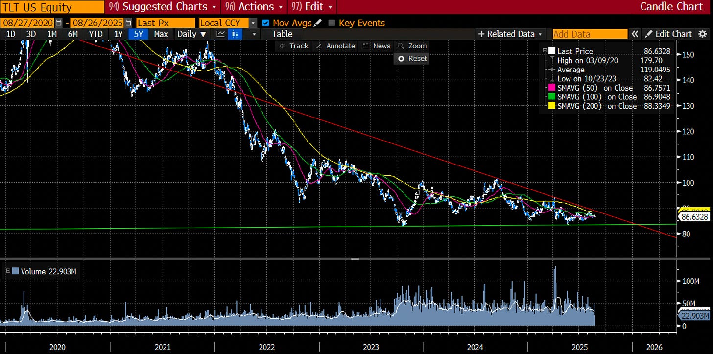 Zooming out for a second here. Looking at the TLT long-term chart would indicate that, despite the narrative of higher rates, the realised volatility has decreased substantially compared to previous years. We were finding typical coiling patterns, with volatility compression ultimately resulting in a bigger move. We stand ready.