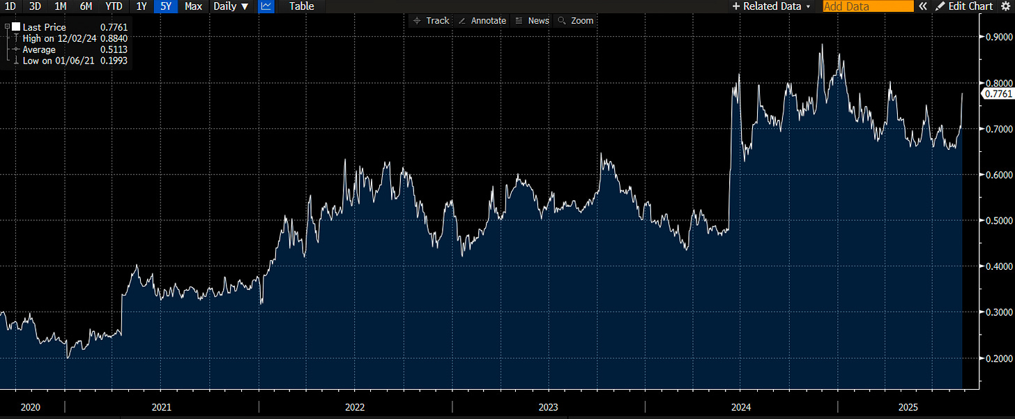Some quick-fire thoughts and charts for our mid-week musings, with markets so far showing some erratic swings as we are heading into month-end games. The whole parody around Trump ordering Governor Cook’s dismissal is another good reminder that the pressure on the Fed will not decrease anytime soon. It’s a tricky and unprecedented situation with many legal as well as personal question marks being raised. It all reminds me of a typical emerging market move. Not surprised the curve steepened, and the Dollar is selling off on the news. Who is not entertained?