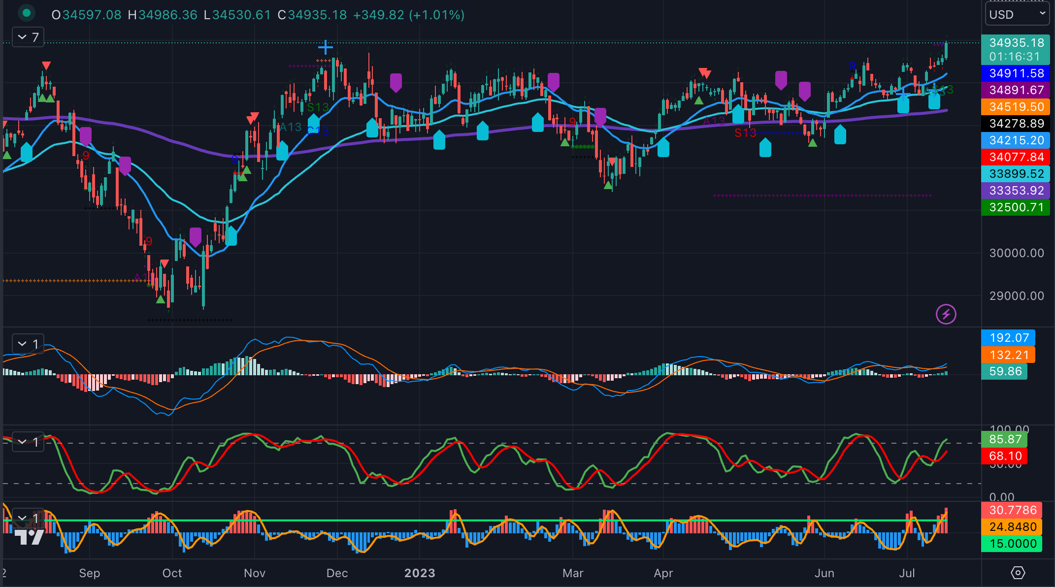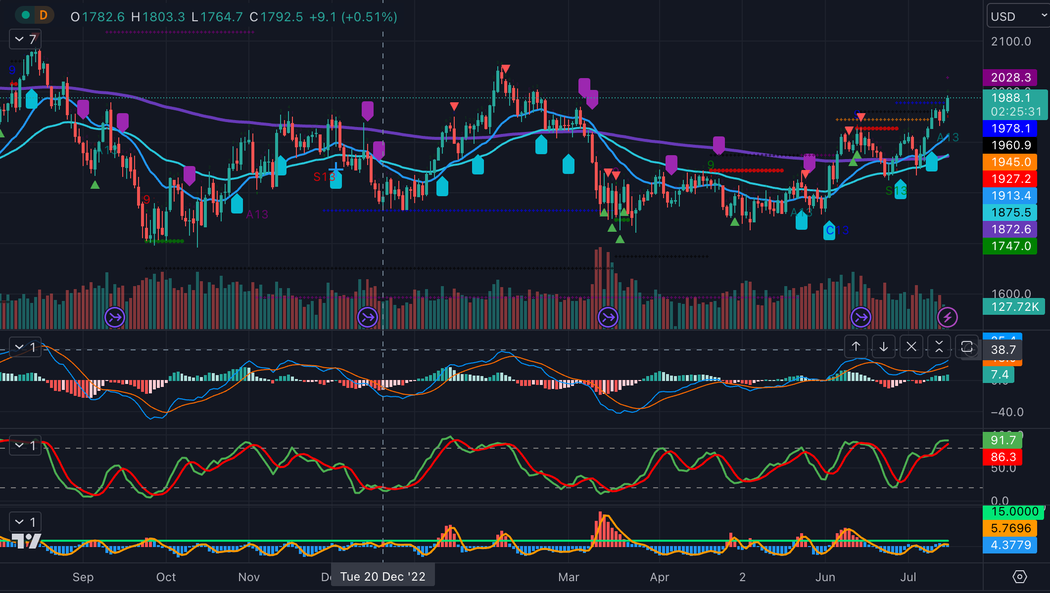 ES, we have a first overbought condition flashing. You can see this in the bottom right corner, where we have a first bar flashing. The full reversal signal (red triangle) will then flash with the first weaker daily candle close.