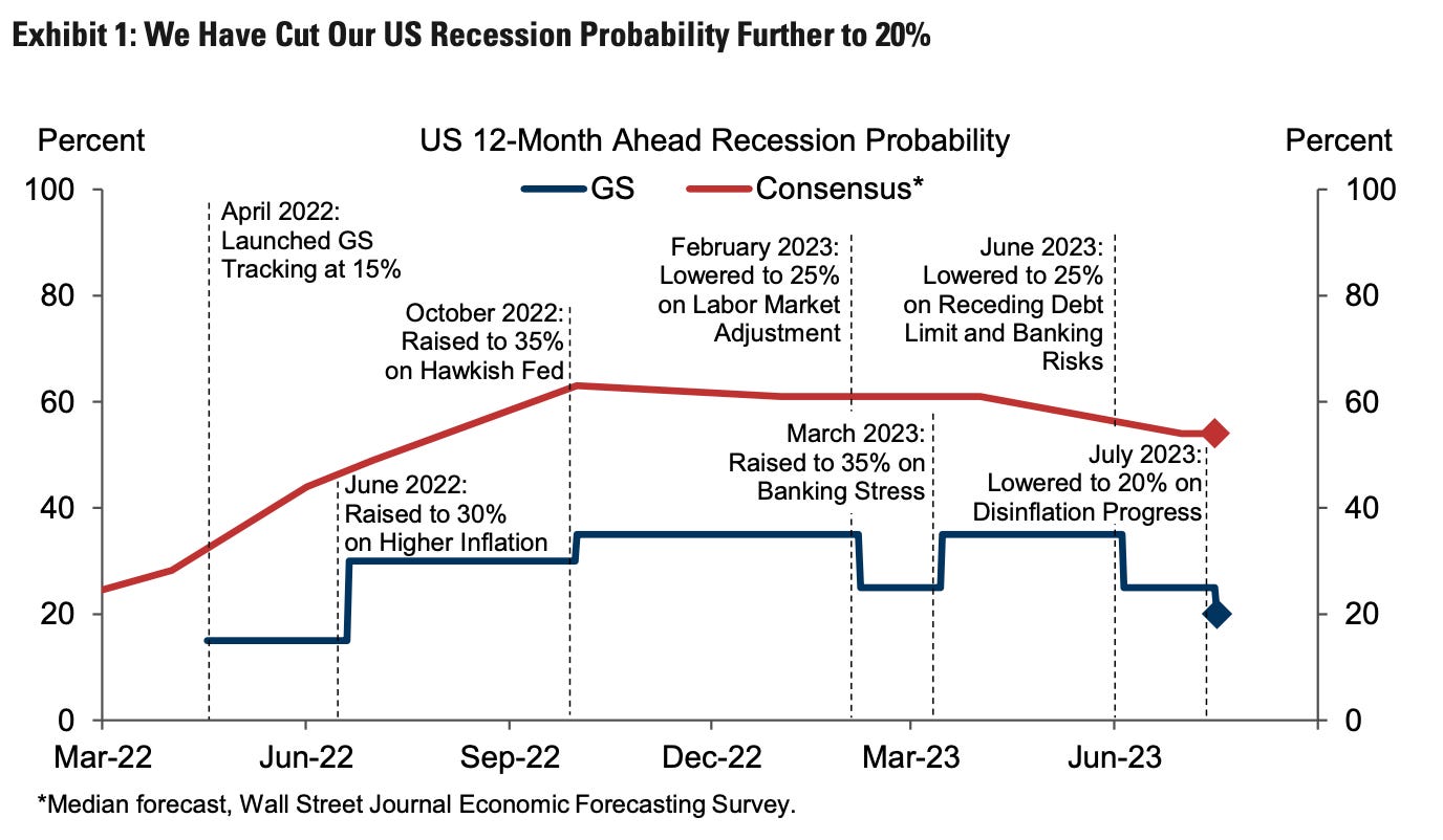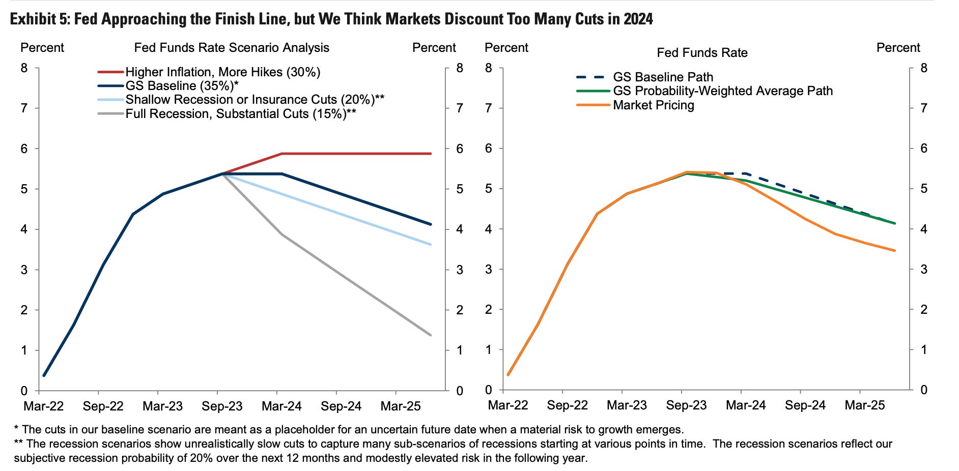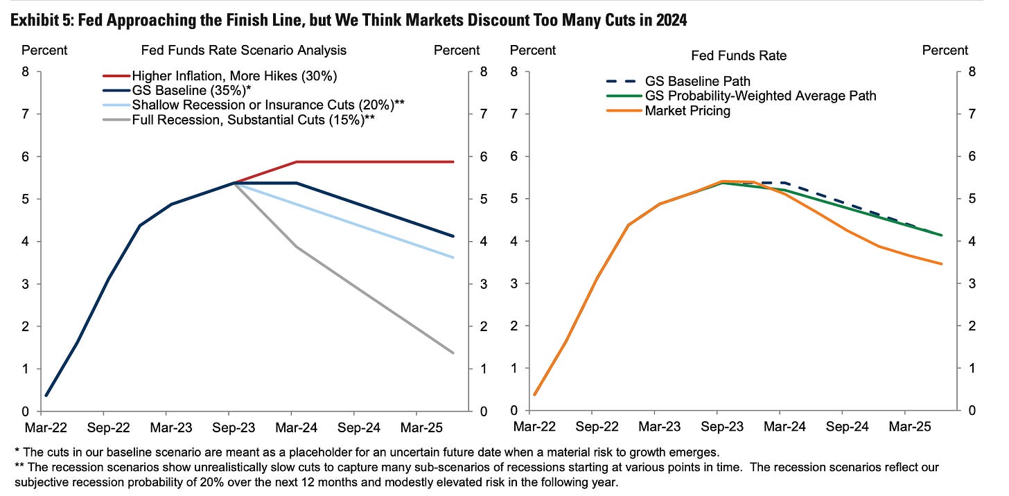Similar to my take earlier this week about the monetary policy hill top approaching, their research team led by Jan Hatzius also declares the end of the monetary tightening cycle, with a higher inflation scenario only moving Fed Funds up to 6%, which I think is rather low if such an outcome should arise.